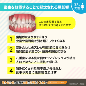 噛み合わせのズレや、歯列の乱れが他の問題を引き起こす可能性もあるため、以下のような悪影響が懸念されました。